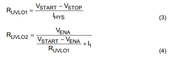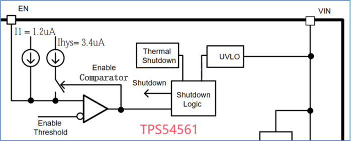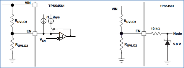 According to the datasheet, the TPS54561 EN pin includes a pull-up current source I1 = 1.2μA, a hysteresis current source Ihys = 3.4μA, and V_ENA = 1.2V (EN pin threshold). The UVLO threshold is configured using two voltage-divider resistors, as shown in the following formula: